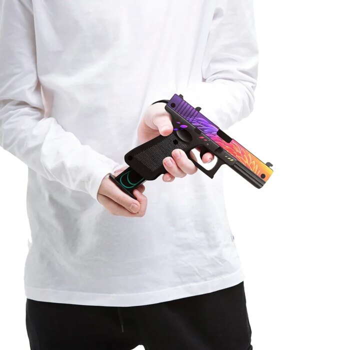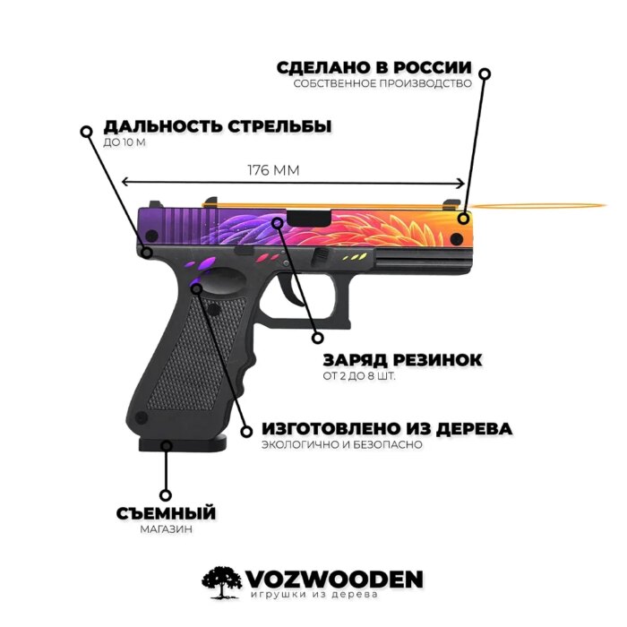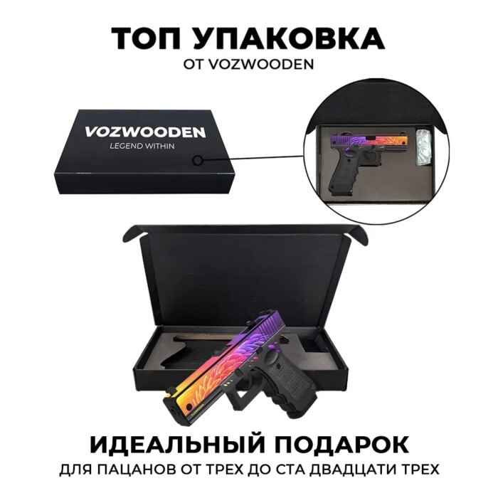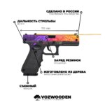 Некоторые фанаты утверждают, что G22 | Нест из Standoff 2 списан с Glock-18 | Градиент из CS:GO. Но выбирать что-то одно необязательно: можно купить оба этих пистолета из дерева от VozWooden, сравнить внешне, на ощупь, даже на вкус и сделать вывод. Фанат каждой из двух стрелялок непременно найдёт в ассортименте что-то для себя — отменное качество и приятная стоимость гарантированы. Конечно, деревянное оружие не будет переливаться, как на экране, но вместе с тем держать его в руках будешь именно ты, а не персонаж, которым управляешь, более того, резинкострел и встроенный магазин дают возможность не только разучивать трюки, но и тренировать меткость и скоростную перезарядку — смотря что больше нравится.