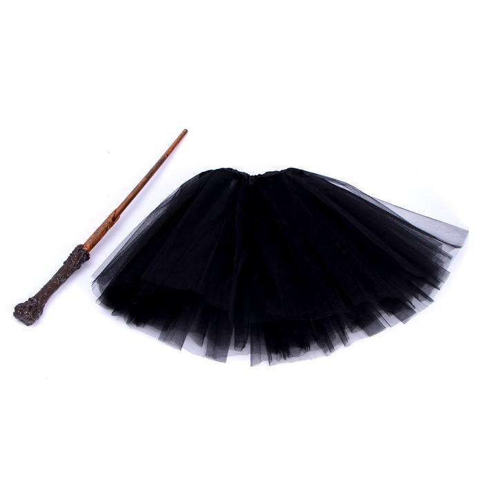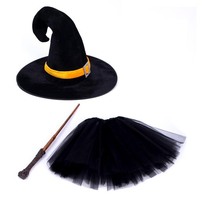 Комплект наряда состоит из шляпы ведьмовской, юбки и волшебной палочки.