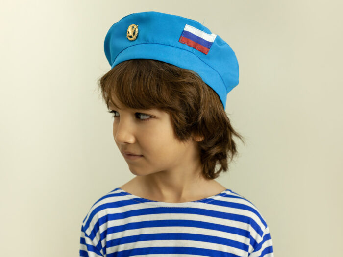 Комплектация детского костюма Десантника для мальчика МИНИВИНИ: тельняшка, голубой берет с эмблемой и российским флагом, ремень резинка застежка — фастекс.