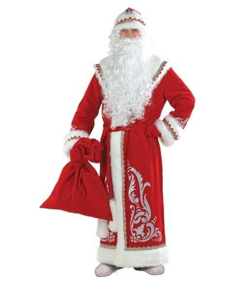 Комплектация: шуба из парчи на подкладке, шапка с меховым отворотом, варежки, пояс, борода, парик, мешок .